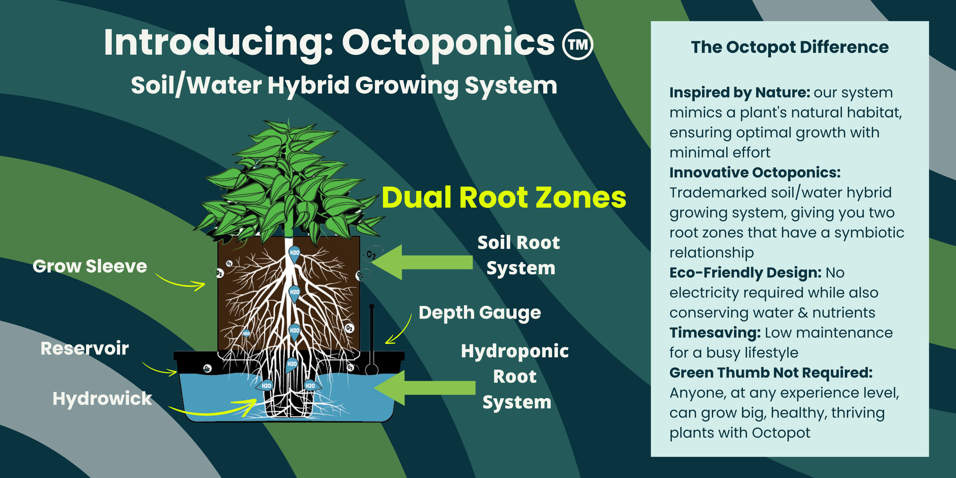 Octopot's patented system provides 2 root zones for your plants: one in the soil & one in the hydro reservoir.